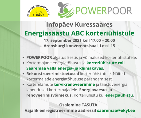 Infopäeval kõnelevad Eesti Korteriühistute Liidu, Saaremaa Vallavalitsuse, SA KredEx ja Tartu Regiooni Energiaagentuuri eksperdid sellest, millised võimalused on korteriühistutel energia säästmiseks ja kuidas saavad ühistud aidata kaasa energiavaesuse vähendamisele.